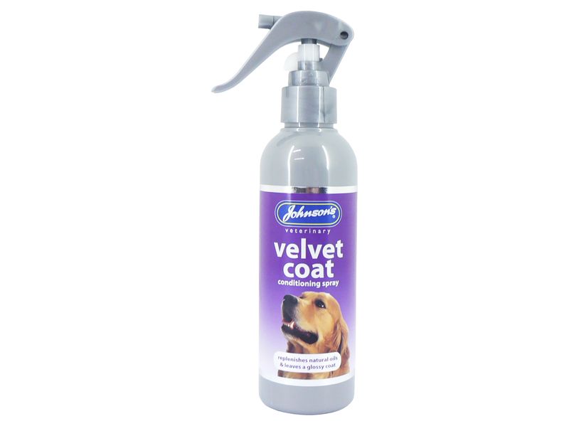 Johnsons Velvet Coat Conditioning Spray is a superior coat conditioner which replenishes natural oils, gives a glossy sheen and a soft, velvet finish. Especially beneficial for dry and lifeless coats. Regular use helps to prevent matting, leaving the coat easy to manage with a pleasant fresh fragrance.