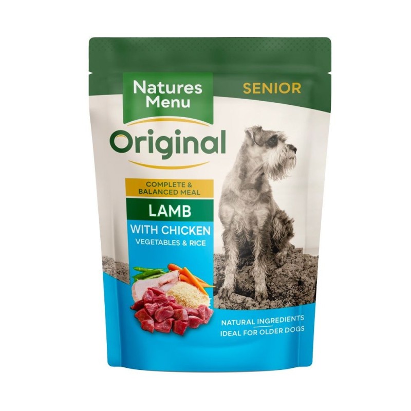 A healthy, natural, low fat complete meal for senior, less active dogs. Made with flavoursome Lamb, Chicken and wholesome vegetables, brown rice and our special blend of vitamins and minerals. Our wet food pouches are filled with quality ingredients, then gently cooked to ensure all the Natures Menu goodness is locked in. A great alternative to raw feeding when travelling or staying away. We only use quality, human grade meats in our pouches, and absolutely no meat meals or meat derivatives. All of our complete and balanced meals are veterinary approved and made to FEDIAF guidelines.,Lamb 40%, Rice 4%, Chicken 20%, Peas 4%, Carrots 4%, Minerals
