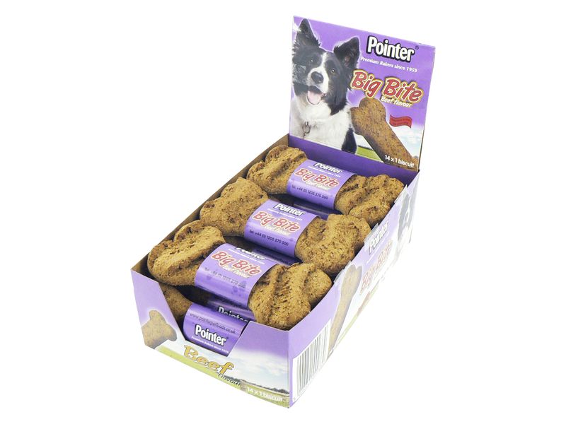 Crunchy, oven baked bone shaped biscuits for dogs, Pointer Big Bite Biscuits are big on flavour and big on size too! They make and ideal treat or reward for good behaviour for you Canine companion.